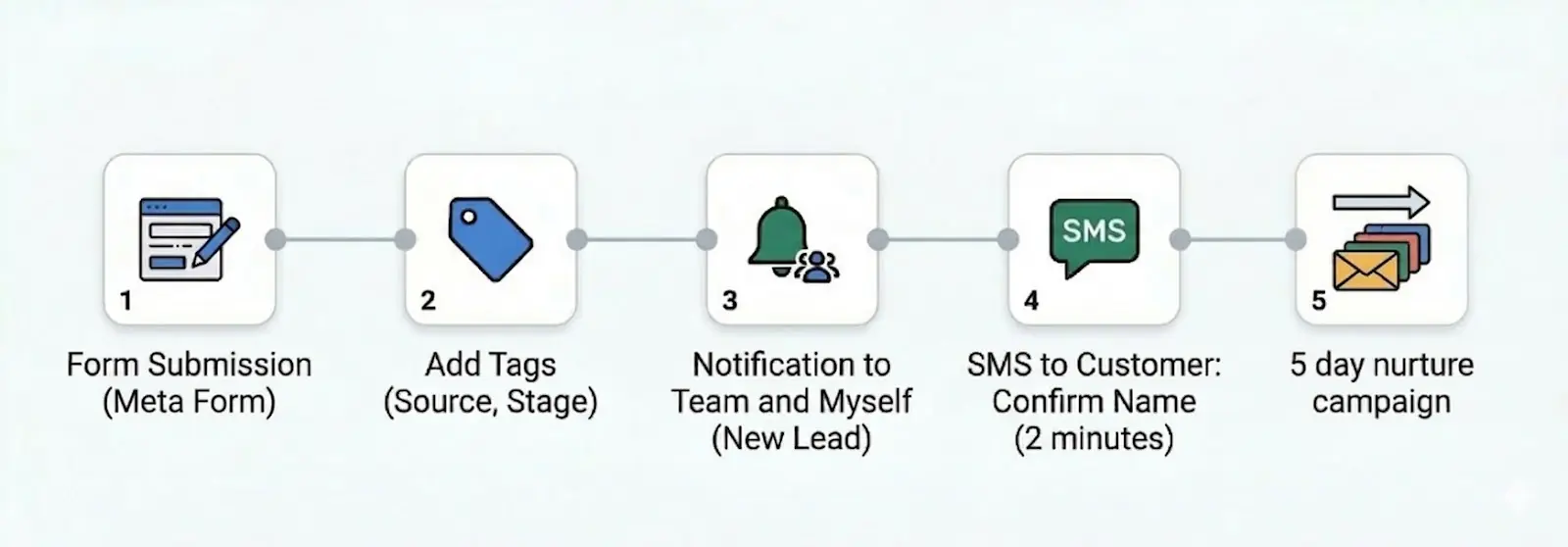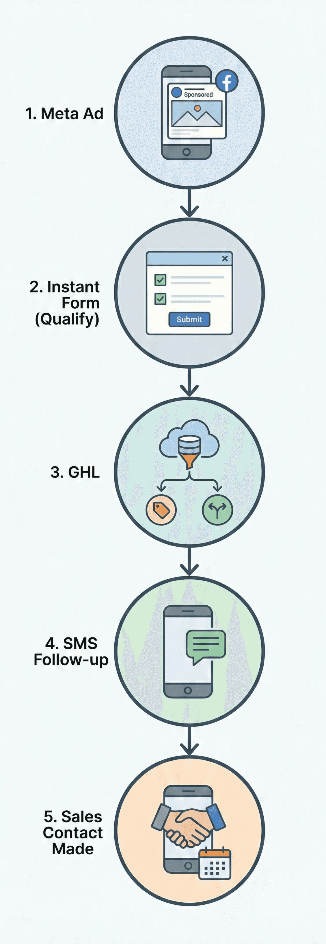 My goal was to build a complete pipeline that could increase lead flow and save time. From engaging ad creatives to instant form qualification to automated SMS follow-up.